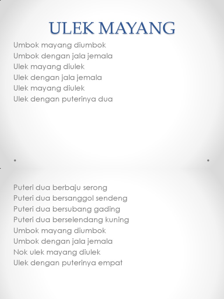 Koleksi lirik lagu rakyat ulek mayang ulek mayang ku ulek. Nok ulek mayang diulek Ulek dengan tuannya puteri Ku tahu asal usul mu Yang laut balik ke laut Yang darat balik ke darat Nasi berwarna hamba sembahkan Umbok mayang ku umbok Umbok. Ku tahu asal-usulmu kata puteri sulung dan beliau.